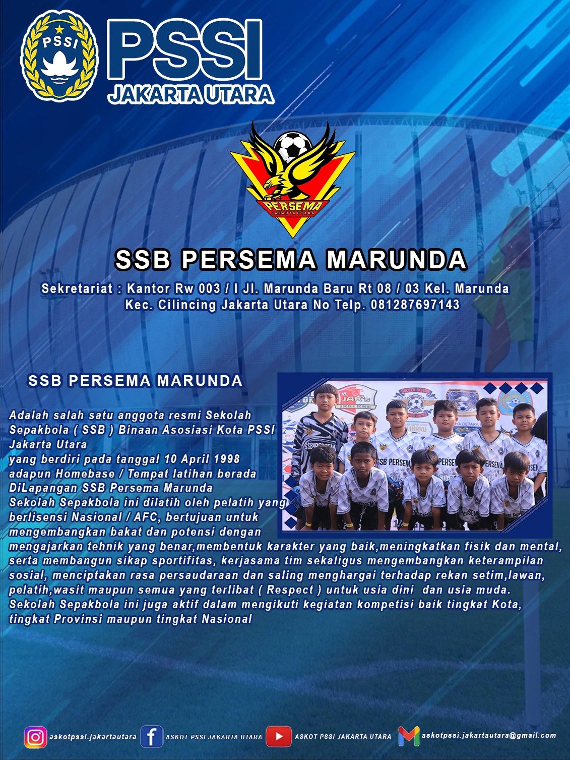 SSB Persema Marunda adalah salah satu anggota resmi sekolah sepakbola (SSB) Binaan Asosiasi Kota PSSI Jakarta Utara. SSB yang berdiri pada 10 April 1998. Adapun Homebase/tempat latihan berada di Lapangan SSB Persema Marunda. sekolah sepakbola ini dilatih oleh pelatih yang berlisensi nasional/AFC, bertujuan untuk mengembangkan bakat dan potensi dengan mengajarkan tehnik yang benar, membentuk karakter yang baik, meningkatkan fisik dan mental, serta membangun sikap sportifitas, kerjasama tim sekaligus mengembangkan keterampilan sosial, menciptakan rasa persaudaraan dan saling menhargai terhadap rekan setim, lawan, pelatih, wasit maupun semua yang terlibat (Respect) untuk usia dini dan usia muda. sekolah sepakbola ini juga aktif dalam mengikuti kegiatan kompetisi baik tingkat kota, tingkat provinsi maupun tingkat nasional.