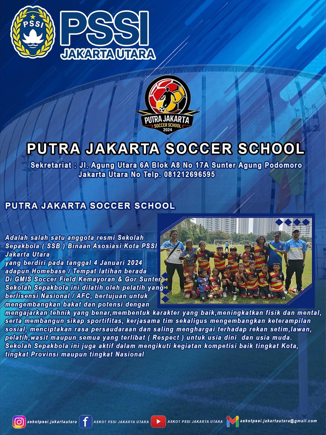 SSB Putra Jakarta Soccer School adalah salah satu anggota resmi sekolah sepakbola (SSB) Binaan Asosiasi Kota PSSI Jakarta Utara. SSB yang berdiri pada 4 Januari 2024. Adapun Homebase/tempat latihan berada di GMIS Soccer Field Kemayoran & GOR Sunter. sekolah sepakbola ini dilatih oleh pelatih yang berlisensi nasional/AFC, bertujuan untuk mengembangkan bakat dan potensi dengan mengajarkan tehnik yang benar, membentuk karakter yang baik, meningkatkan fisik dan mental, serta membangun sikap sportifitas, kerjasama tim sekaligus mengembangkan keterampilan sosial, menciptakan rasa persaudaraan dan saling menhargai terhadap rekan setim, lawan, pelatih, wasit maupun semua yang terlibat (Respect) untuk usia dini dan usia muda. sekolah sepakbola ini juga aktif dalam mengikuti kegiatan kompetisi baik tingkat kota, tingkat provinsi maupun tingkat nasional.