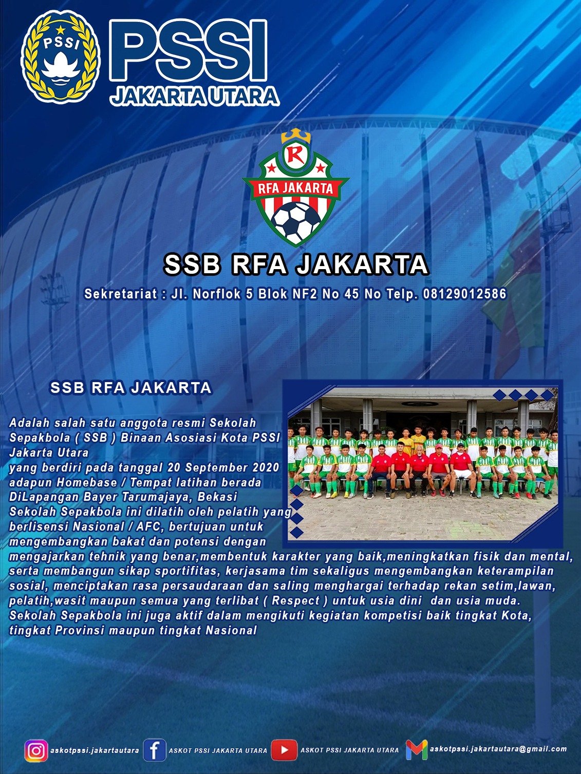 SSB RFA Jakarta adalah salah satu anggota resmi sekolah sepakbola (SSB) Binaan Asosiasi Kota PSSI Jakarta Utara. SSB yang berdiri pada 20 september 2020. Adapun Homebase/tempat latihan berada di Lapangan Bayer Tarumajaya, Bekasi. sekolah sepakbola ini dilatih oleh pelatih yang berlisensi nasional/AFC, bertujuan untuk mengembangkan bakat dan potensi dengan mengajarkan tehnik yang benar, membentuk karakter yang baik, meningkatkan fisik dan mental, serta membangun sikap sportifitas, kerjasama tim sekaligus mengembangkan keterampilan sosial, menciptakan rasa persaudaraan dan saling menhargai terhadap rekan setim, lawan, pelatih, wasit maupun semua yang terlibat (Respect) untuk usia dini dan usia muda. sekolah sepakbola ini juga aktif dalam mengikuti kegiatan kompetisi baik tingkat kota, tingkat provinsi maupun tingkat nasional.