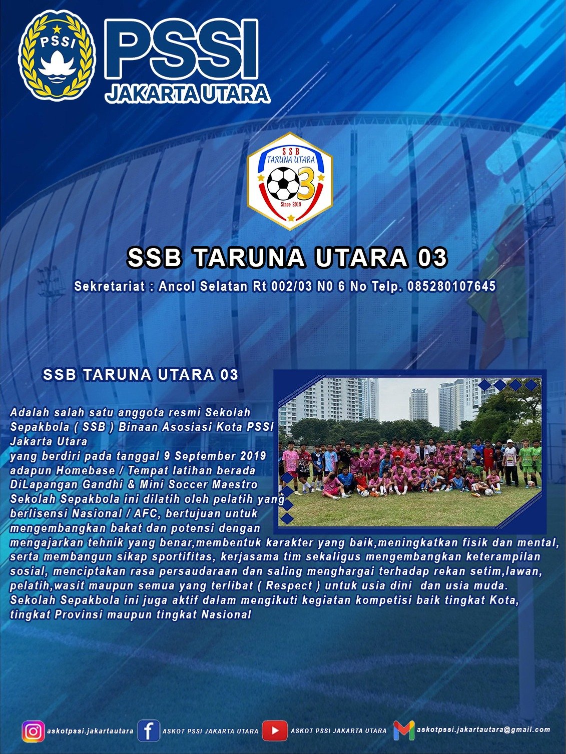 SSB Taruna Muda 03 adalah salah satu anggota resmi sekolah sepakbola (SSB) Binaan Asosiasi Kota PSSI Jakarta Utara. SSB yang berdiri pada 9 septemer 2019. Adapun Homebase/tempat latihan berada di Lapangan Gandhi & mini Soccer Maestro. sekolah sepakbola ini dilatih oleh pelatih yang berlisensi nasional/AFC, bertujuan untuk mengembangkan bakat dan potensi dengan mengajarkan tehnik yang benar, membentuk karakter yang baik, meningkatkan fisik dan mental, serta membangun sikap sportifitas, kerjasama tim sekaligus mengembangkan keterampilan sosial, menciptakan rasa persaudaraan dan saling menhargai terhadap rekan setim, lawan, pelatih, wasit maupun semua yang terlibat (Respect) untuk usia dini dan usia muda. sekolah sepakbola ini juga aktif dalam mengikuti kegiatan kompetisi baik tingkat kota, tingkat provinsi maupun tingkat nasional.